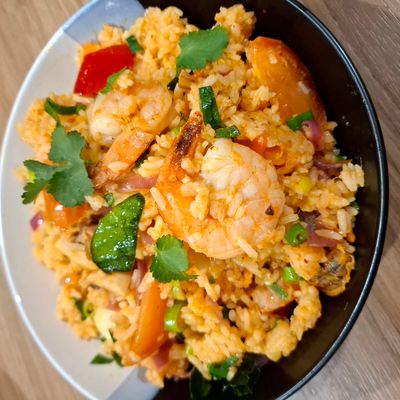 Seafood Tom Yum Fried Rice combines the bold, tangy flavors of authentic Thai cuisine with a savory mix of seafood and aromatic spices. Perfect for those seeking a flavorful rice dish with a touch of zest.