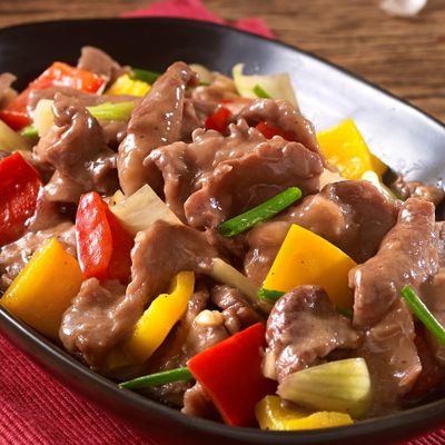 Stir-fried Beef in Black Pepper Sauce features tender beef slices coated in a rich, aromatic black pepper sauce. Perfect as a savory dish to pair with steamed rice or noodles.