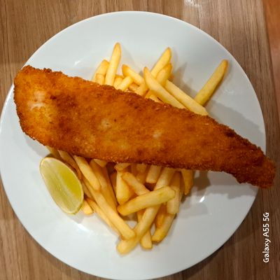 Enjoy a classic with Fish & Chips, featuring flaky, tender fish coated in a crispy golden batter. A timeless dish perfect for any occasion.