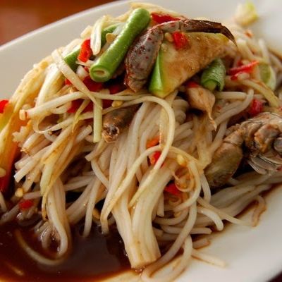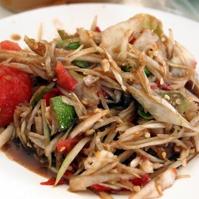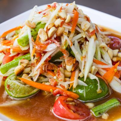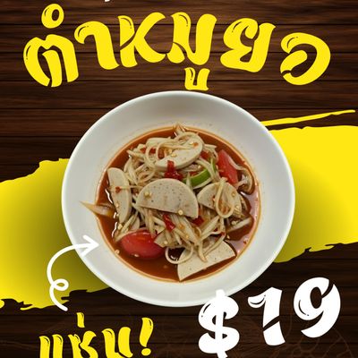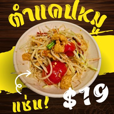 Tum Thai is a traditional Thai green papaya salad, combining crisp shredded papaya with a tangy, spicy, and savory dressing. A classic dish perfect for those who enjoy bold, authentic flavors.
