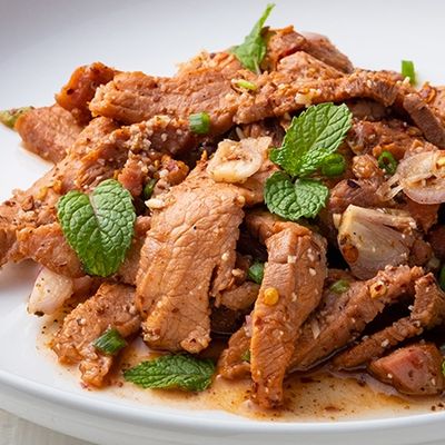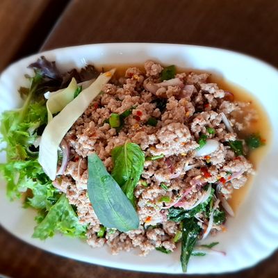 Labb Moo is a spicy Thai pork salad featuring ground pork, lime juice, chili, and fresh herbs. This flavorful dish is a perfect blend of tangy, savory, and refreshing elements.