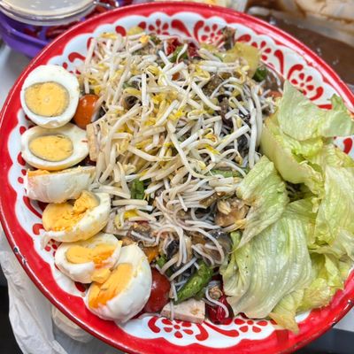 Tum Kanomjeen is a traditional Thai dish featuring fermented rice noodles served with a flavorful and spicy salad. Perfect for those seeking authentic Thai cuisine with a bold taste.