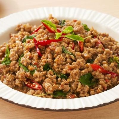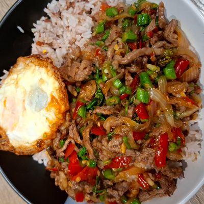 This set features stir-fried meat with Thai basil (ผัดกระเพรา) served over rice and topped with a fried egg. A classic Thai dish that's flavorful and satisfying for any meal.