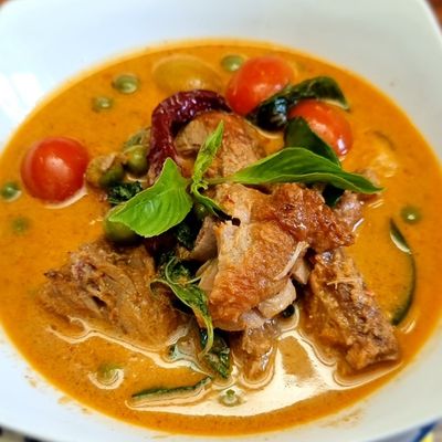 Duck curry (แกงเผ็ดเป็ดย่าง) features tender roasted duck in a rich, aromatic red curry sauce, enhanced with coconut milk and traditional Thai spices. A flavorful dish perfect for lovers of authentic Thai cuisine.