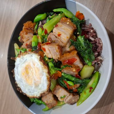 This set features stir-fried Chinese broccoli with crispy pork served over rice, topped with a fried egg. A classic and satisfying meal option inspired by Thai cuisine.