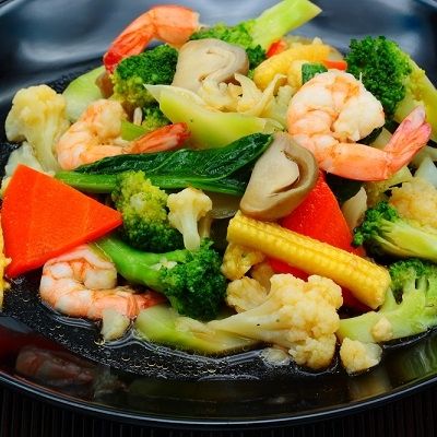 The Stir-fried Mixed Vegetables set features a flavorful medley of fresh vegetables served over steamed rice. A simple and wholesome meal option for any time of the day.