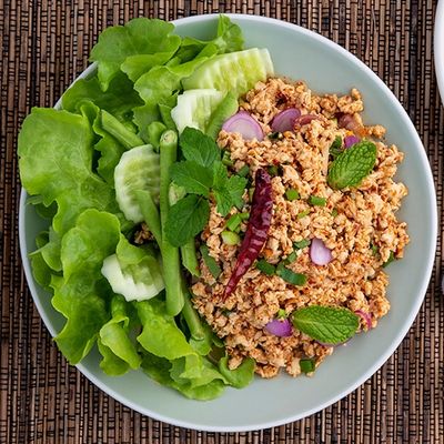 Labb Kai is a flavorful Thai salad featuring minced chicken, fresh herbs, and a tangy lime dressing. Perfect as a light, refreshing meal or appetizer.